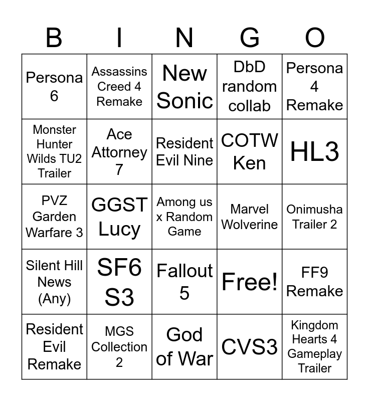 This bingo card has 25 words: SF6 S3, God of War, Resident Evil Nine, Resident Evil Remake, Persona 4 Remake, Persona 6, Monster Hunter Wilds TU2 Trailer, Assassins Creed 4 Remake, Marvel Wolverine, Fallout 5, COTW Ken, PVZ Garden Warfare 3, Free!, FF9 Remake, Ace Attorney 7, Kingdom Hearts 4 Gameplay Trailer, Onimusha Trailer 2, New Sonic, HL3, GGST Lucy, Among us x Random Game, MGS Collection 2, Silent Hill News (Any), DbD random collab and CVS3.
