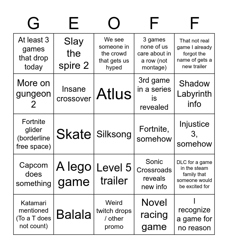 This bingo card has 25 words: A lego game, Weird twitch drops / other promo, Atlus, Katamari mentioned (To a T does not count), That not real game I already forgot the name of gets a new trailer, At least 3 games that drop today, More on gungeon 2, Slay the spire 2, Fortnite, somehow, Level 5 trailer, 3rd game in a series is revealed, Fortnite glider (borderline free space), Sonic Crossroads reveals new info, DLC for a game in the steam family that someone would be excited for, Insane crossover, I recognize a game for no reason, Injustice 3, somehow, We see someone in the crowd that gets us hyped, Shadow Labyrinth info, Skate, Silksong, Balala, Capcom does something, 3 games none of us care about in a row (not montage) and Novel racing game.