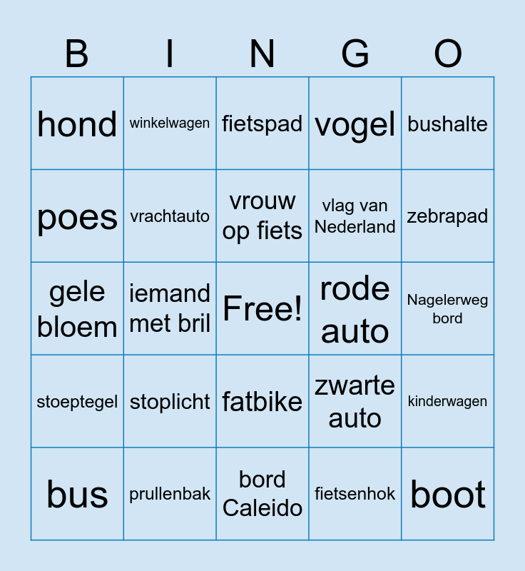 This bingo card has a free space and 24 words: stoplicht, prullenbak, vrouw op fiets, bus, bushalte, hond, poes, winkelwagen, rode auto, fatbike, vlag van Nederland, gele bloem, zwarte auto, kinderwagen, vrachtauto, fietsenhok, Nagelerweg bord, fietspad, zebrapad, iemand met bril, boot, stoeptegel, vogel and bord Caleido.