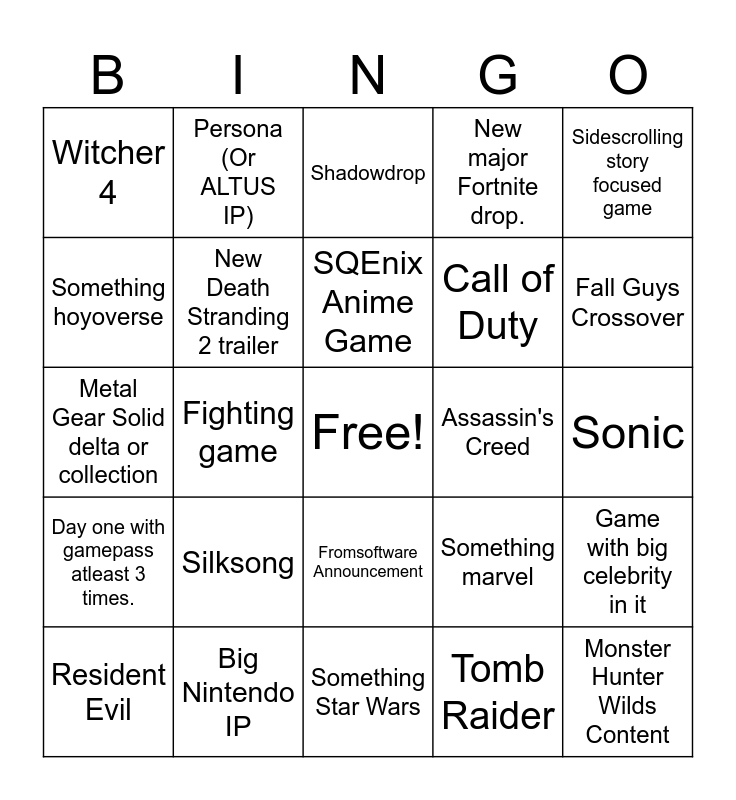This bingo card has a free space and 24 words: Silksong, Big Nintendo IP, SQEnix Anime Game, Resident Evil, Sidescrolling story focused game, Witcher 4, Something hoyoverse, Persona (Or ALTUS IP), Assassin's Creed, Fromsoftware Announcement, Call of Duty, Metal Gear Solid delta or collection, Something marvel, Game with big celebrity in it, New Death Stranding 2 trailer, Tomb Raider, Sonic, Shadowdrop, Fall Guys Crossover, Fighting game, Monster Hunter Wilds Content, Day one with gamepass atleast 3 times., New major Fortnite drop. and Something Star Wars.