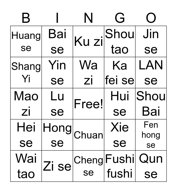 This bingo card has a free space and 24 words: Hong se, Zi se, Wa zi, Wai tao, Jin se, Huang se, Shang Yi, Bai se, Hui se, Chuan, Ka fei se, Mao zi, Xie se, Fen hong se, Yin se, Fushi fushi, Shou Bai, Ku zi, LAN se, Lu se, Qun se, Hei se, Shou tao and Cheng se.