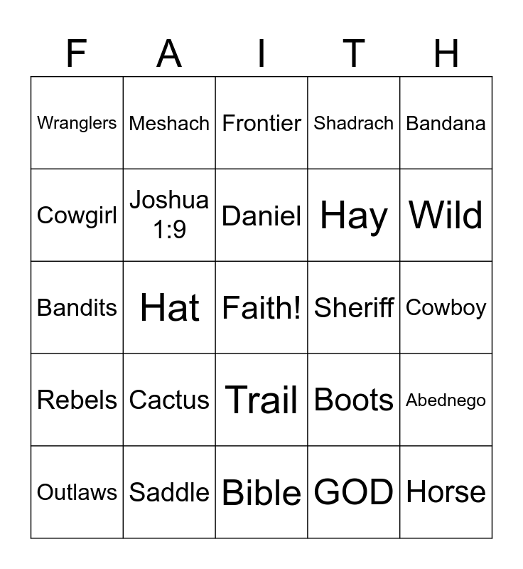 This bingo card has a free space and 29 words: Outlaws, Marshall, Hat, Obey, Wranglers, Frontier, Joshua 1:9, Cactus, Sheriff, Saddle, Cowboy, Horse, Bible, GOD, Wild, Jesus, Trail, Rebels, Bandana, Bandits, Boots, Deputy, Hay, Cowgirl, Shadrach, Meshach, Abednego, Daniel and Apostle.