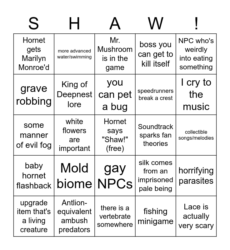 This bingo card has a free space and 24 words: Mold biome, Antlion-equivalent ambush predators, you can pet a bug, upgrade item that's a living creature, NPC who's weirdly into eating something, Hornet gets Marilyn Monroe'd, grave robbing, more advanced water/swimming, Soundtrack sparks fan theories, gay NPCs, speedrunners break a crest, some manner of evil fog, silk comes from an imprisoned pale being, horrifying parasites, King of Deepnest lore, fishing minigame, collectible songs/melodies, Mr. Mushroom is in the game, I cry to the music, white flowers are important, Lace is actually very scary, baby hornet flashback, boss you can get to kill itself and there is a vertebrate somewhere.