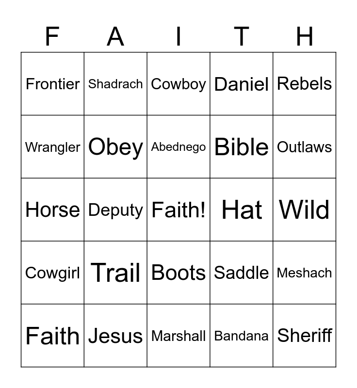 This bingo card has a free space and 29 words: Faith, Bandits, Deputy, Cactus, Frontier, Cowboy, Obey, Trail, Hat, Jesus, Wild, Sheriff, Marshall, Bandana, Outlaws, Joshua 1:9, Boots, Cowgirl, Rebels, Horse, Saddle, GOD, Bible, Wrangler, Daniel, Shadrach, Meshach, Abednego and Apostle.