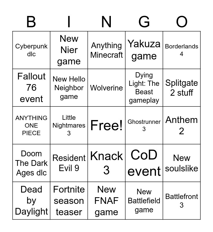 This bingo card has a free space and 24 words: Resident Evil 9, Fortnite season teaser, Wolverine, Dead by Daylight, Borderlands 4, Cyberpunk dlc, Fallout 76 event, New Nier game, Ghostrunner 3, Knack 3, Dying Light: The Beast gameplay, ANYTHING ONE PIECE, CoD event, New soulslike, New Hello Neighbor game, New Battlefield game, Anthem 2, Anything Minecraft, Splitgate 2 stuff, Little Nightmares 3, Battlefront 3, Doom The Dark Ages dlc, Yakuza game and New FNAF game.