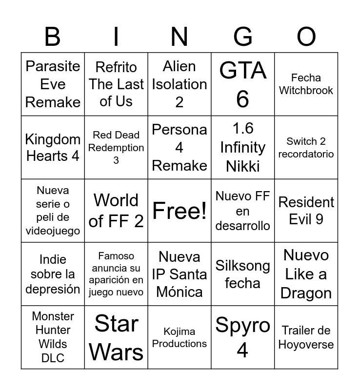 This bingo card has a free space and 24 words: Famoso anuncia su aparición en juego nuevo, Star Wars, Persona 4 Remake, Monster Hunter Wilds DLC, Fecha Witchbrook, Parasite Eve Remake, Kingdom Hearts 4, Refrito The Last of Us, Nuevo FF en desarrollo, Nueva IP Santa Mónica, 1.6 Infinity Nikki, Nueva serie o peli de videojuego, Silksong fecha, Nuevo Like a Dragon, Red Dead Redemption 3, Spyro 4, Resident Evil 9, Alien Isolation 2, Switch 2 recordatorio, World of FF 2, Trailer de Hoyoverse, Indie sobre la depresión, GTA 6 and Kojima Productions.