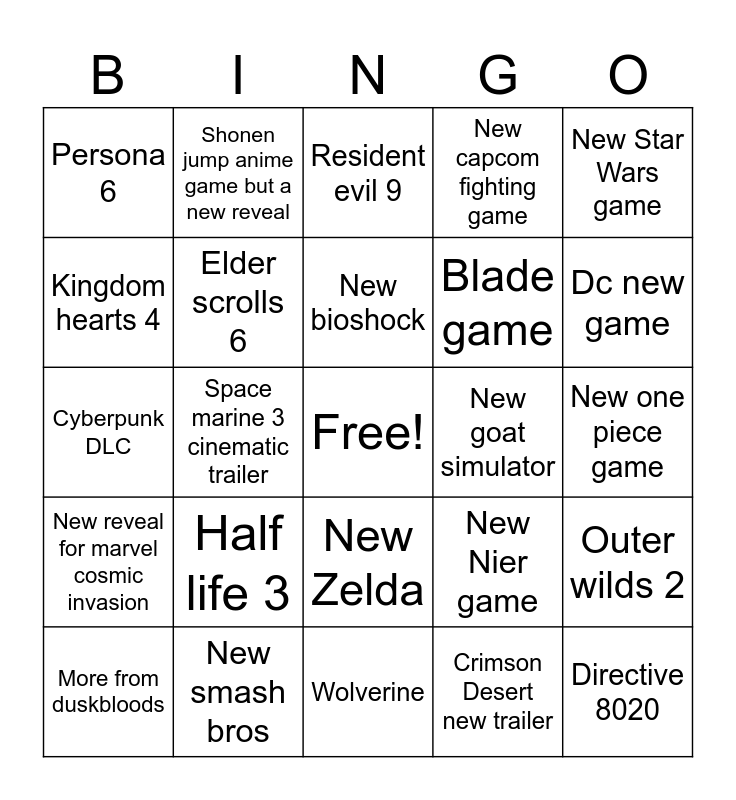 This bingo card has a free space and 24 words: Half life 3, New smash bros, New bioshock, More from duskbloods, New Star Wars game, Persona 6, Kingdom hearts 4, Shonen jump anime game but a new reveal, New goat simulator, New Zelda, Blade game, Cyberpunk DLC, New Nier game, Outer wilds 2, Elder scrolls 6, Crimson Desert new trailer, New one piece game, Resident evil 9, Dc new game, Space marine 3 cinematic trailer, Directive 8020, New reveal for marvel cosmic invasion, New capcom fighting game and Wolverine.
