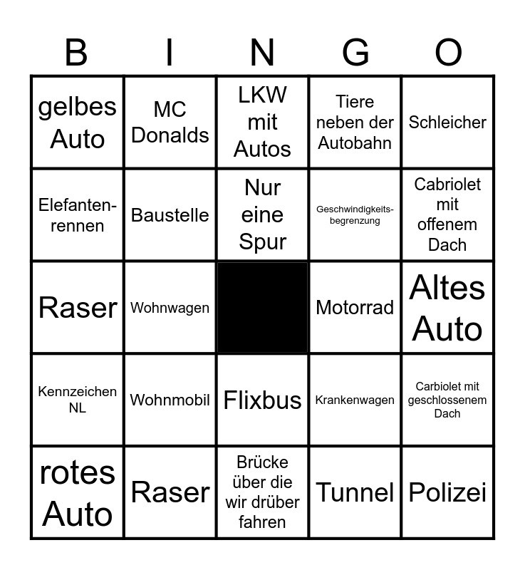 This bingo card has a free space and 29 words: rotes Auto, drehendes Windrad, Wohnwagen, Rastplatz, gelbes Auto, LKW mit Autos, Baustelle, Wohnmobil, Motorrad, Raser, Altes Auto, Polizei, Brücke über die wir drüber fahren, Tunnel, Cabriolet mit offenem Dach, Fahrrad auf dem Dach, Flixbus, Kennzeichen NL, Schleicher, Raser, Krankenwagen, Baustelle, Geschwindigkeits- begrenzung, Elefanten- rennen, Tiere neben der Autobahn, MC Donalds, Carbiolet mit geschlossenem Dach, Nur eine Spur and Tunnel.