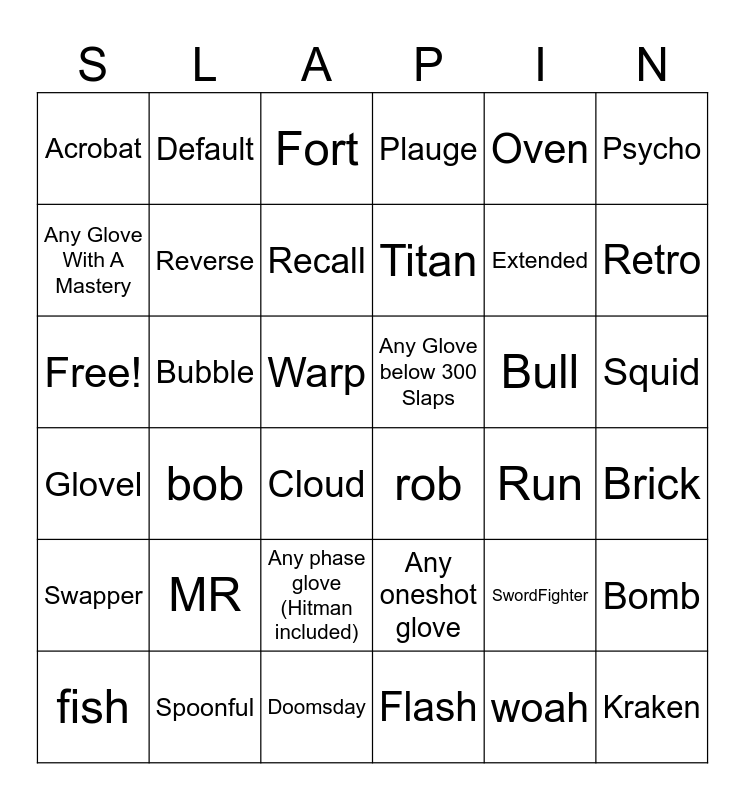 This bingo card has 36 words: Any oneshot glove, Any phase glove (Hitman included), Flash, Any Glove With A Mastery, Glovel, Any Glove below 300 Slaps, Reverse, Doomsday, Oven, SwordFighter, Retro, Plauge, Bomb, Bubble, Titan, Acrobat, Swapper, Bull, Free!, Fort, Warp, bob, rob, Cloud, Run, Default, Extended, Spoonful, Recall, Psycho, Kraken, fish, Brick, Squid, MR and woah.