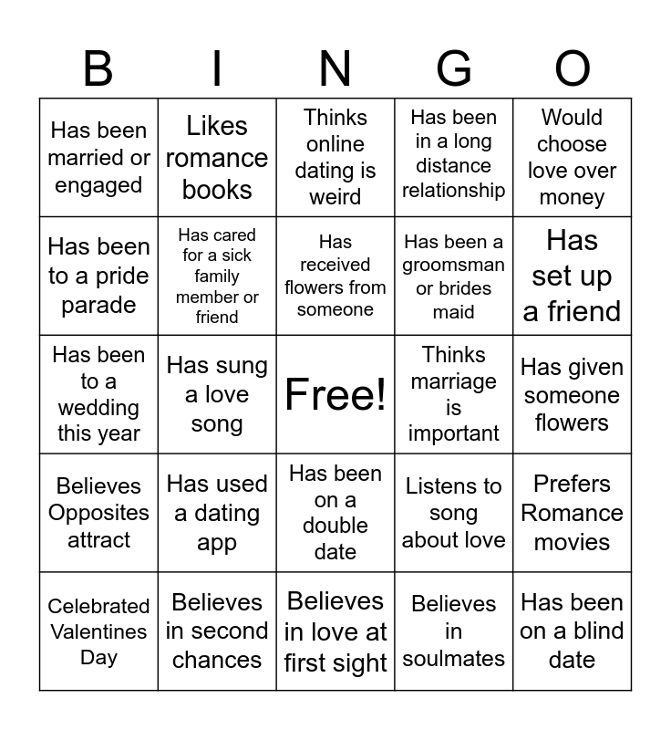 This bingo card has a free space and 24 words: Has used a dating app, Believes in second chances, Has received flowers from someone, Celebrated Valentines Day, Would choose love over money, Has been married or engaged, Has been to a pride parade, Likes romance books, Thinks marriage is important, Has been on a double date, Has been a groomsman or brides maid, Has been to a wedding this year, Listens to song about love, Prefers Romance movies, Has cared for a sick family member or friend, Believes in soulmates, Has given someone flowers, Thinks online dating is weird, Has set up a friend, Has sung a love song, Has been on a blind date, Believes Opposites attract, Has been in a long distance relationship and Believes in love at first sight.