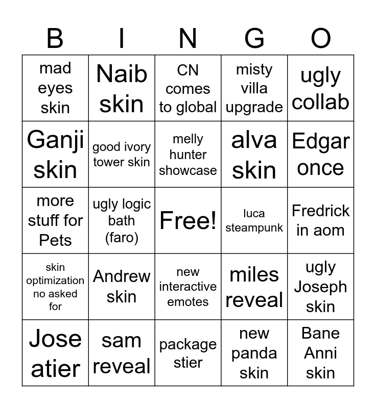 This bingo card has a free space and 24 words: Andrew skin, sam reveal, melly hunter showcase, Jose atier, ugly collab, mad eyes skin, Ganji skin, Naib skin, luca steampunk, new interactive emotes, alva skin, more stuff for Pets, miles reveal, ugly Joseph skin, good ivory tower skin, new panda skin, Fredrick in aom, CN comes to global, Edgar once, ugly logic bath (faro), Bane Anni skin, skin optimization no asked for, misty villa upgrade and package stier.