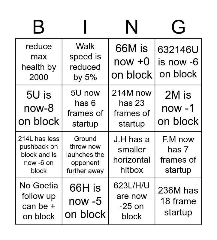 This bingo card has 16 words: 66H is now -5 on block, F.M now has 7 frames of startup, 66M is now +0 on block, reduce max health by 2000, 214L has less pushback on block and is now -6 on block, Walk speed is reduced by 5%, J.H has a smaller horizontal hitbox, 623L/H/U are now -25 on block, 5U is now-8 on block, 5U now has 6 frames of startup, No Goetia follow up can be + on block, 632146U is now -6 on block, Ground throw now launches the opponent further away, 2M is now -1 on block, 214M now has 23 frames of startup and 236M has 18 frame startup.