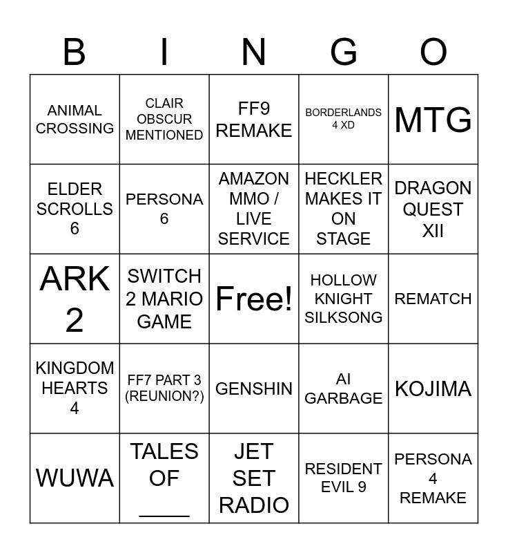 This bingo card has a free space and 24 words: FF7 PART 3 (REUNION?), TALES OF ____, AMAZON MMO / LIVE SERVICE, WUWA, MTG, ANIMAL CROSSING, ELDER SCROLLS 6, CLAIR OBSCUR MENTIONED, HOLLOW KNIGHT SILKSONG, GENSHIN, HECKLER MAKES IT ON STAGE, ARK 2, AI GARBAGE, KOJIMA, PERSONA 6, RESIDENT EVIL 9, REMATCH, FF9 REMAKE, DRAGON QUEST XII, SWITCH 2 MARIO GAME, PERSONA 4 REMAKE, KINGDOM HEARTS 4, BORDERLANDS 4 XD and JET SET RADIO.