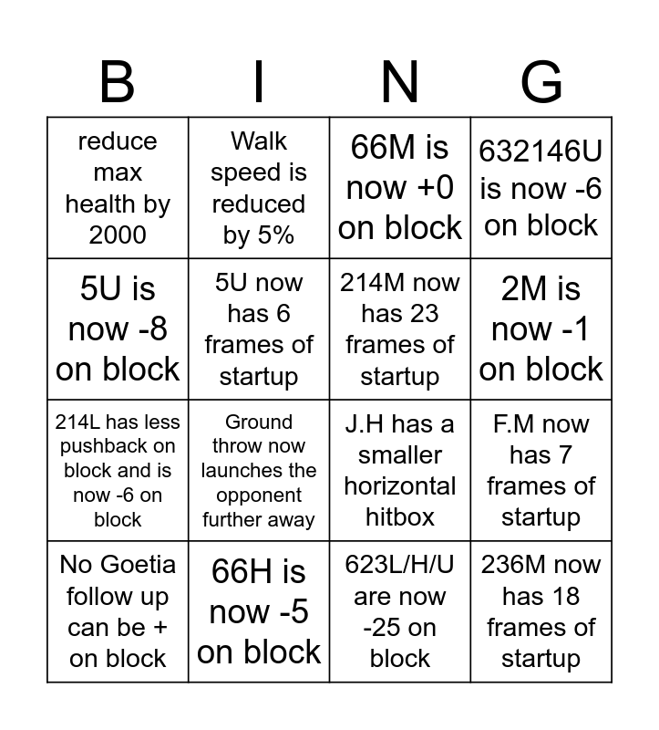 This bingo card has 16 words: 66H is now -5 on block, F.M now has 7 frames of startup, 66M is now +0 on block, reduce max health by 2000, 214L has less pushback on block and is now -6 on block, Walk speed is reduced by 5%, J.H has a smaller horizontal hitbox, 623L/H/U are now -25 on block, 5U is now -8 on block, 5U now has 6 frames of startup, No Goetia follow up can be + on block, 632146U is now -6 on block, Ground throw now launches the opponent further away, 2M is now -1 on block, 214M now has 23 frames of startup and 236M now has 18 frames of startup.
