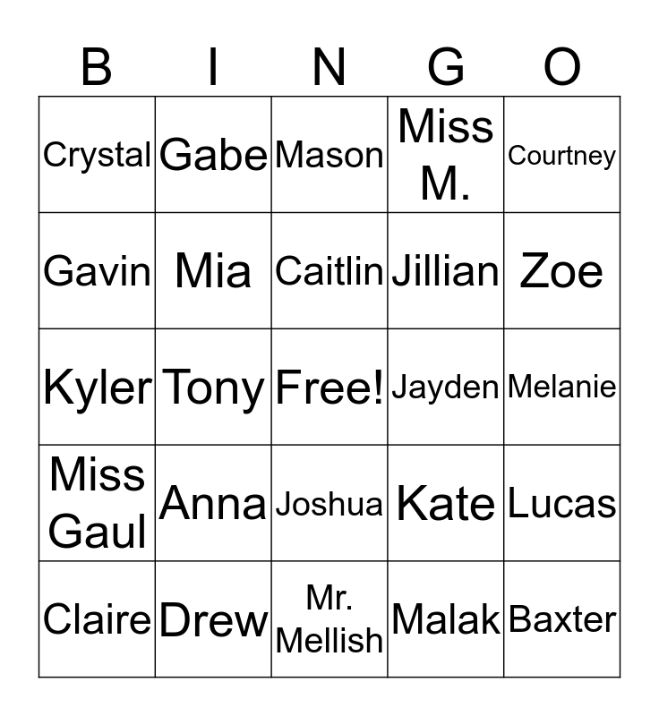 This bingo card has a free space and 24 words: Anna, Drew, Caitlin, Claire, Courtney, Crystal, Gavin, Gabe, Jayden, Joshua, Jillian, Kyler, Kate, Lucas, Mia, Malak, Melanie, Mason, Zoe, Tony, Baxter, Miss Gaul, Miss M. and Mr. Mellish.
