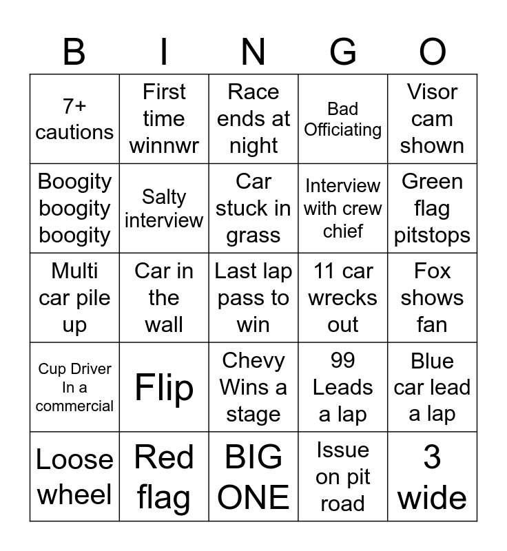 This bingo card has 25 words: Cup Driver In a commercial, Red flag, Last lap pass to win, Issue on pit road, Visor cam shown, 7+ cautions, First time winnwr, Race ends at night, 11 car wrecks out, Blue car lead a lap, Boogity boogity boogity, Salty interview, BIG ONE, 99 Leads a lap, Green flag pitstops, Loose wheel, Car in the wall, Car stuck in grass, Interview with crew chief, Fox shows fan, Multi car pile up, Flip, Chevy Wins a stage, Bad Officiating and 3 wide.