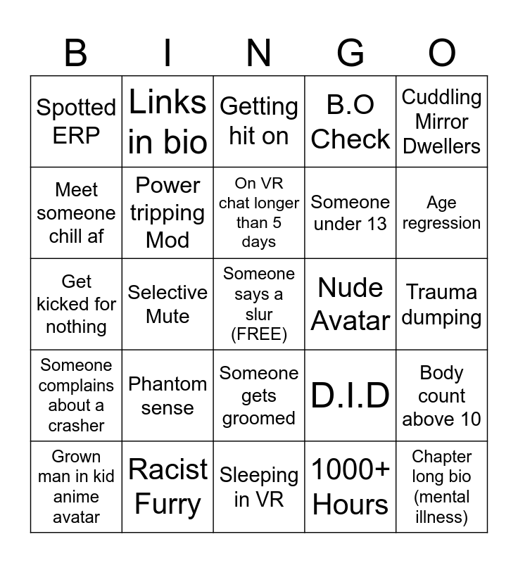 This bingo card has a free space and 29 words: Grown man in kid anime avatar, E-Date in public, Selective Mute, VR Family, Spotted ERP, Getting hit on, Power tripping Mod, Phantom sense, Nude Avatar, Racist Furry, Trauma dumping, Chapter long bio (mental illness), Sleeping in VR, 1000+ Hours, Age regression, Force a crashout, Someone gets groomed, Someone complains about a crasher, Cuddling Mirror Dwellers, Get kicked for nothing, D.I.D, "I'm so drunk/high", Someone under 13, Meet someone chill af, B.O Check, Links in bio, Body count above 10, On VR chat longer than 5 days and Spotted sexual consent form/job app.