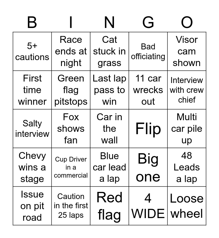 This bingo card has 25 words: Cup Driver in a commercial, Red flag, Last lap pass to win, Issue on pit road, Visor cam shown, 5+ cautions, First time winner, Race ends at night, Flip, Blue car lead a lap, 11 car wrecks out, Salty interview, Big one, 48 Leads a lap, Green flag pitstops, Loose wheel, Multi car pile up, Cat stuck in grass, Interview with crew chief, Fox shows fan, Car in the wall, Caution in the first 25 laps, Chevy wins a stage, Bad officiating and 4 WIDE.