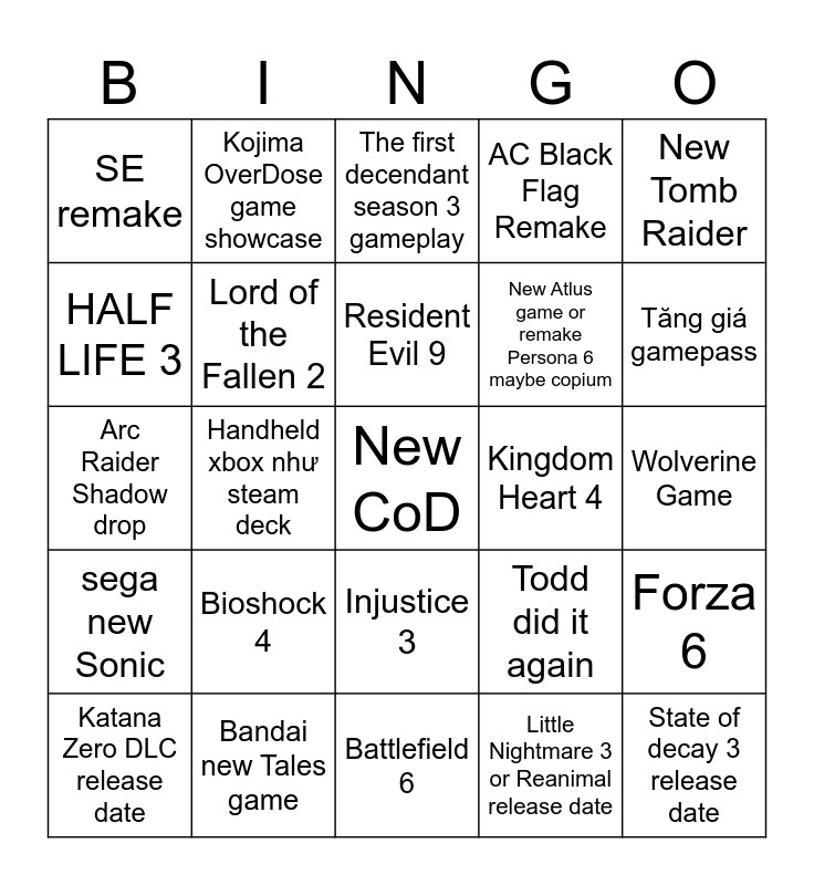 This bingo card has a free space and 24 words: Bioshock 4, Bandai new Tales game, Resident Evil 9, Katana Zero DLC release date, New Tomb Raider, SE remake, HALF LIFE 3, Kojima OverDose game showcase, Kingdom Heart 4, Injustice 3, New Atlus game or remake Persona 6 maybe copium, Arc Raider Shadow drop, Todd did it again, Forza 6, Lord of the Fallen 2, Little Nightmare 3 or Reanimal release date, Wolverine Game, The first decendant season 3 gameplay, Tăng giá gamepass, Handheld xbox như steam deck, State of decay 3 release date, sega new Sonic, AC Black Flag Remake and Battlefield 6.