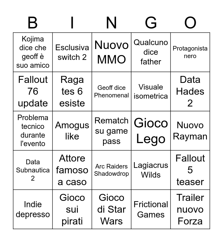 This bingo card has 25 words: Attore famoso a caso, Gioco di Star Wars, Geoff dice Phenomenal, Indie depresso, Protagonista nero, Kojima dice che geoff è suo amico, Fallout 76 update, Esclusiva switch 2, Gioco Lego, Arc Raiders Shadowdrop, Visuale isometrica, Problema tecnico durante l'evento, Lagiacrus Wilds, Fallout 5 teaser, Raga tes 6 esiste, Trailer nuovo Forza, Nuovo Rayman, Nuovo MMO, Data Hades 2, Amogus like, Rematch su game pass, Gioco sui pirati, Data Subnautica 2, Qualcuno dice father and Frictional Games.