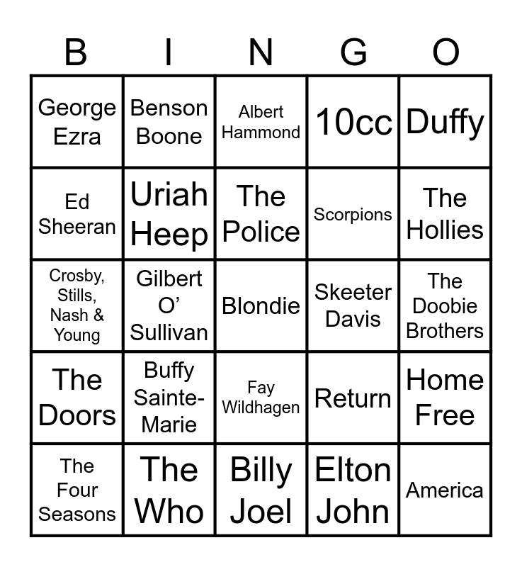 This bingo card has 25 words: Buffy Sainte-Marie, Billy Joel, The Police, The Four Seasons, Duffy, George Ezra, Ed Sheeran, Benson Boone, Skeeter Davis, Fay Wildhagen, Scorpions, Crosby, Stills, Nash & Young, Return, Home Free, Uriah Heep, America, The Doobie Brothers, Albert Hammond, The Hollies, Gilbert O’ Sullivan, Blondie, The Who, The Doors, 10cc and Elton John.