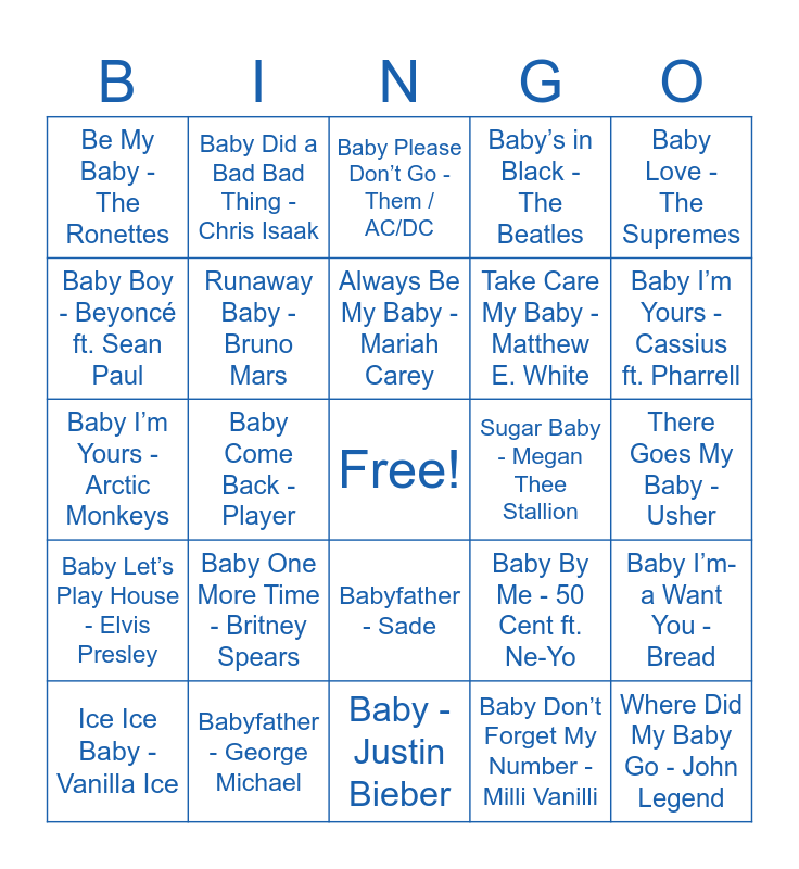 This bingo card has a free space and 25 words: Baby One More Time - Britney Spears, Baby -Justin Bieber, Always Be My Baby - Mariah Carey, Ice Ice Baby - Vanilla Ice, Baby Love - The Supremes, Be My Baby - The Ronettes, Baby Boy - Beyoncé ft. Sean Paul, Baby Did a Bad Bad Thing - Chris Isaak, Sugar Baby - Megan Thee Stallion, Babyfather - Sade, Take Care My Baby - Matthew E. White, Baby I’m Yours - Arctic Monkeys, Baby By Me - 50 Cent ft. Ne-Yo, Baby I’m-a Want You - Bread, Runaway Baby - Bruno Mars, Baby Mine - Bette Midler / Dumbo OST, There Goes My Baby - Usher, Baby Please Don’t Go - Them / AC/DC, Baby I’m Yours - Cassius ft. Pharrell, Baby Come Back - Player, Where Did My Baby Go - John Legend, Babyfather - George Michael, Baby Let’s Play House - Elvis Presley, Baby’s in Black - The Beatles and Baby Don’t Forget My Number - Milli Vanilli.