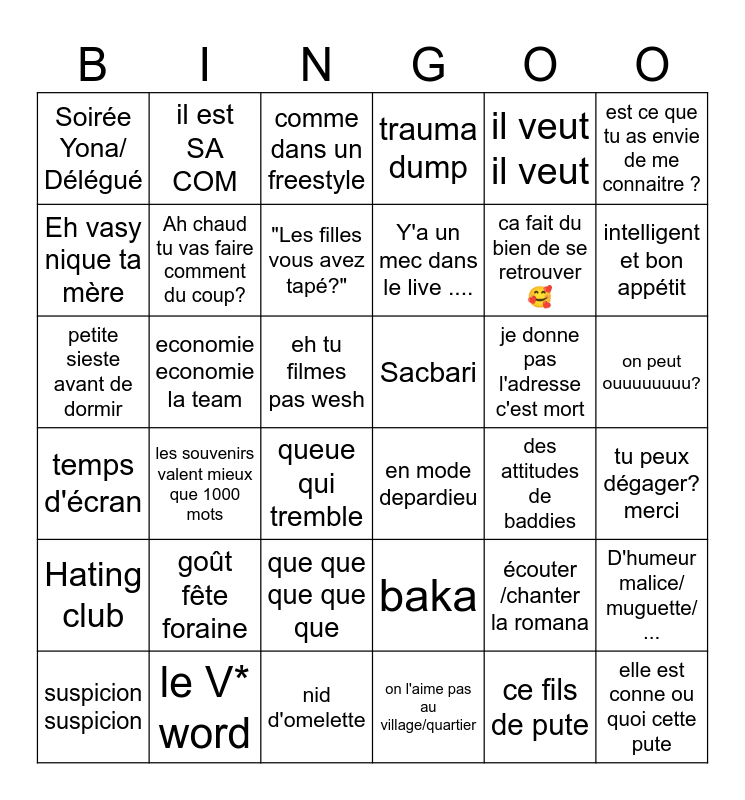 This bingo card has 36 words: baka, que que que que que, on l'aime pas au village/quartier, Eh vasy nique ta mère, temps d'écran, Sacbari, Ah chaud tu vas faire comment du coup?, nid d'omelette, il veut il veut, écouter /chanter la romana, intelligent et bon appétit, trauma dump, D'humeur malice/ muguette/ ..., economie economie la team, Y'a un mec dans le live ...., Soirée Yona/ Délégué, Hating club, je donne pas l'adresse c'est mort, petite sieste avant de dormir, comme dans un freestyle, eh tu filmes pas wesh, les souvenirs valent mieux que 1000 mots, en mode depardieu, queue qui tremble, des attitudes de baddies, il est SA COM, ca fait du bien de se retrouver 🥰, le V* word, "Les filles vous avez tapé?", est ce que tu as envie de me connaitre ?, elle est conne ou quoi cette pute, suspicion suspicion, tu peux dégager? merci, on peut ouuuuuuuu?, goût fête foraine and ce fils de pute.