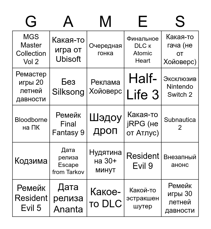 This bingo card has 25 words: Дата релиза Escape from Tarkov, Какое-то DLC, Реклама Хойоверс, Ремейк Resident Evil 5, Какая-то гача (не от Хойоверс), MGS Master Collection Vol 2, Ремастер игры 20 летней давности, Какая-то игра от Ubisoft, Какая-то jRPG (не от Атлус), Нудятина на 30+ минут, Half-Life 3, Bloodborne на ПК, Resident Evil 9, Внезапный анонс, Без Silksong, Ремейк игры 30 летней давности, Subnautica 2, Очередная гонка, Эксклюзив Nintendo Switch 2, Ремейк Final Fantasy 9, Шэдоу дроп, Дата релиза Ananta, Кодзима, Финальное DLC к Atomic Heart and Какой-то эстракшен шутер.