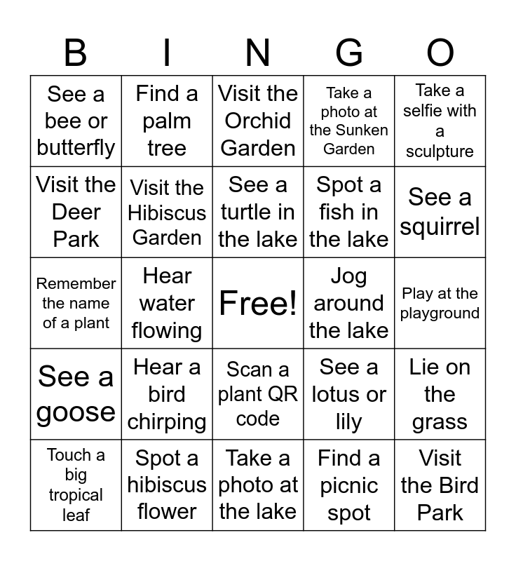 This bingo card has a free space and 24 words: Hear a bird chirping, Spot a hibiscus flower, See a turtle in the lake, Touch a big tropical leaf, Take a selfie with a sculpture, See a bee or butterfly, Visit the Deer Park, Find a palm tree, Jog around the lake, Scan a plant QR code, Spot a fish in the lake, Remember the name of a plant, See a lotus or lily, Lie on the grass, Visit the Hibiscus Garden, Find a picnic spot, Play at the playground, Visit the Orchid Garden, See a squirrel, Hear water flowing, Visit the Bird Park, See a goose, Take a photo at the Sunken Garden and Take a photo at the lake.