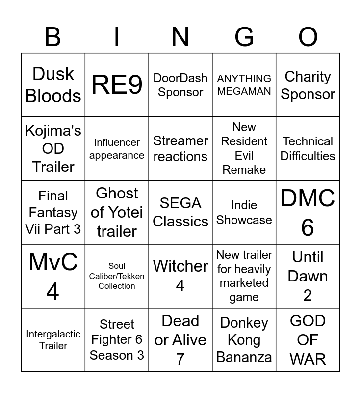 This bingo card has a free space and 34 words: Geoff Keighley, Donkey Kong Bananza, GTA 6 Gameplay update, Wolverine Anything, MvC 4, Influencer appearance, Charity Sponsor, Intergalactic Trailer, RE9, Fable ANYTHING, Streamer reactions, DoorDash Sponsor, Virtua Fighter, Kingdom Hearts 4, Indie Showcase, Technical Difficulties, Street Fighter 6 Season 3, Final Fantasy Vii Part 3, Soul Caliber/Tekken Collection, New trailer for heavily marketed game, Witcher 4, Onimusha Anything, Dusk Bloods, DMC 6, Dead or Alive 7, GOD OF WAR, ANYTHING MEGAMAN, UMvC 3, New Resident Evil Remake, Kojima's OD Trailer, Infamous Anything, Ghost of Yotei trailer, Until Dawn 2 and New Mario Game (NOT MK World).