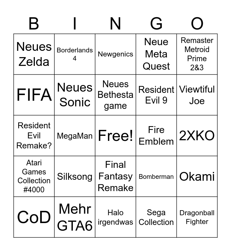 This bingo card has a free space and 24 words: Silksong, Mehr GTA6, Neues Bethesta game, CoD, Remaster Metroid Prime 2&3, Neues Zelda, FIFA, Borderlands 4, Fire Emblem, Final Fantasy Remake, Resident Evil 9, Resident Evil Remake?, Bomberman, Okami, Neues Sonic, Sega Collection, 2XKO, Newgenics, Viewtiful Joe, MegaMan, Dragonball Fighter, Atari Games Collection #4000, Neue Meta Quest and Halo irgendwas.