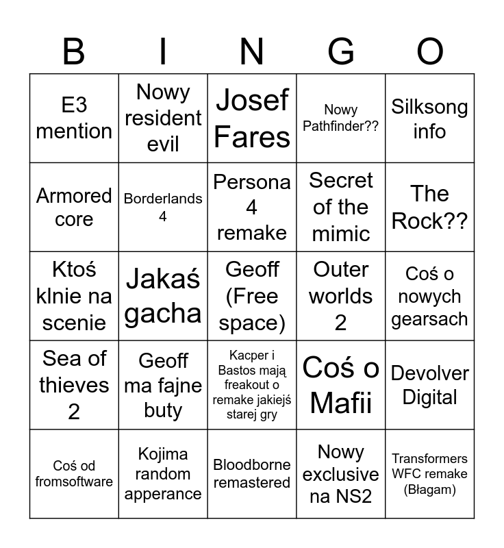 This bingo card has a free space and 24 words: Geoff ma fajne buty, Kojima random apperance, Persona 4 remake, Coś od fromsoftware, Silksong info, E3 mention, Armored core, Nowy resident evil, Outer worlds 2, Kacper i Bastos mają freakout o remake jakiejś starej gry, Secret of the mimic, Ktoś klnie na scenie, Coś o Mafii, Devolver Digital, Borderlands 4, Nowy exclusive na NS2, Coś o nowych gearsach, Josef Fares, The Rock??, Jakaś gacha, Transformers WFC remake (Błagam), Sea of thieves 2, Nowy Pathfinder?? and Bloodborne remastered.