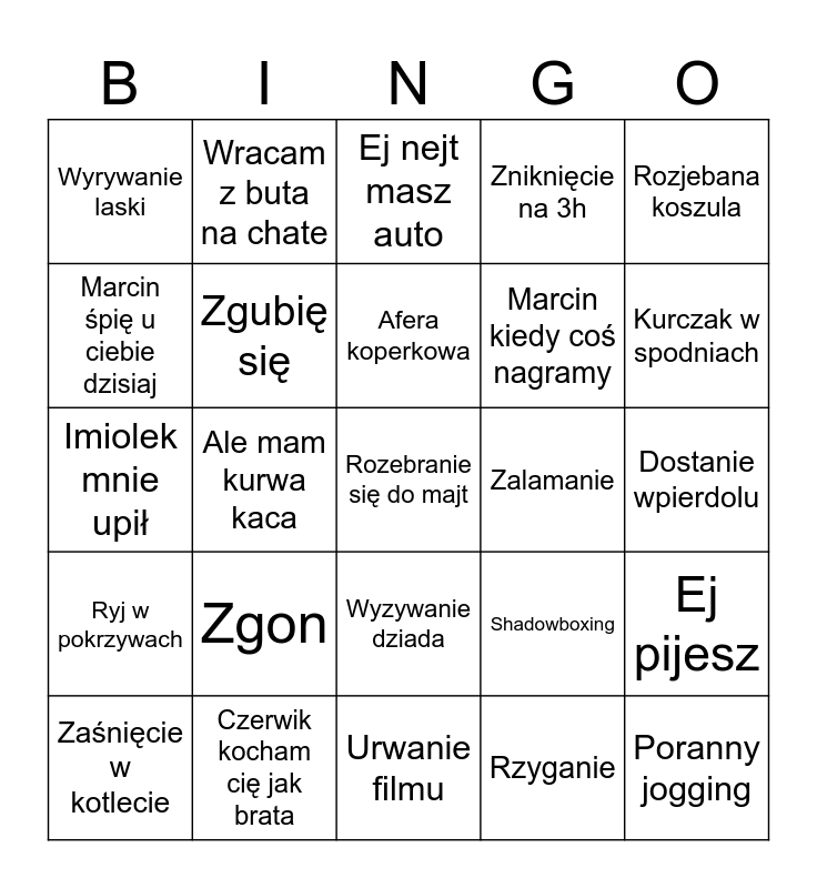 This bingo card has a free space and 24 words: Zgon, Czerwik kocham cię jak brata, Afera koperkowa, Zaśnięcie w kotlecie, Rozjebana koszula, Wyrywanie laski, Marcin śpię u ciebie dzisiaj, Wracam z buta na chate, Zalamanie, Wyzywanie dziada, Marcin kiedy coś nagramy, Imiolek mnie upił, Shadowboxing, Ej pijesz, Zgubię się, Rzyganie, Dostanie wpierdolu, Ej nejt masz auto, Kurczak w spodniach, Ale mam kurwa kaca, Poranny jogging, Ryj w pokrzywach, Zniknięcie na 3h and Urwanie filmu.