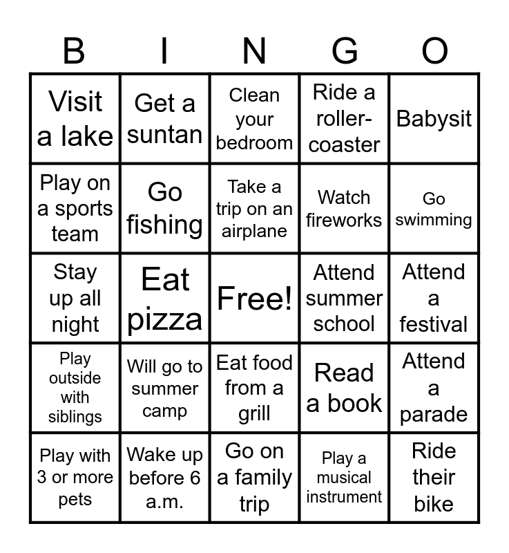 This bingo card has a free space and 24 words: Will go to summer camp, Wake up before 6 a.m., Take a trip on an airplane, Play with 3 or more pets, Babysit, Visit a lake, Play on a sports team, Get a suntan, Attend summer school, Eat food from a grill, Watch fireworks, Stay up all night, Read a book, Attend a parade, Go fishing, Play a musical instrument, Attend a festival, Clean your bedroom, Go swimming, Eat pizza, Ride their bike, Play outside with siblings, Ride a roller-coaster and Go on a family trip.