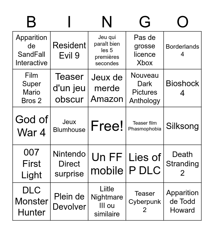 This bingo card has a free space and 24 words: Nintendo Direct surprise, Plein de Devolver, Jeux de merde Amazon, DLC Monster Hunter, Borderlands 4, Apparition de SandFall Interactive, Film Super Mario Bros 2, Resident Evil 9, Teaser film Phasmophobia, Un FF mobile, Nouveau Dark Pictures Anthology, God of War 4, Lies of P DLC, Death Stranding 2, Teaser d'un jeu obscur, Teaser Cyberpunk 2, Silksong, Jeu qui paraît bien les 5 premières secondes, Bioshock 4, Jeux Blumhouse, Apparition de Todd Howard, 007 First Light, Pas de grosse licence Xbox and Liitle Nightmare III ou similaire.