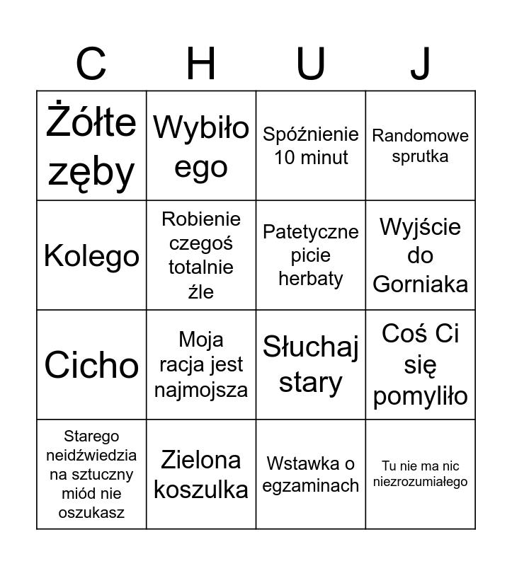 This bingo card has 16 words: Zielona koszulka, Coś Ci się pomyliło, Spóźnienie 10 minut, Żółte zęby, Cicho, Wybiło ego, Słuchaj stary, Wstawka o egzaminach, Kolego, Robienie czegoś totalnie źle, Starego neidźwiedzia na sztuczny miód nie oszukasz, Randomowe sprutka, Moja racja jest najmojsza, Wyjście do Gorniaka, Patetyczne picie herbaty and Tu nie ma nic niezrozumiałego.