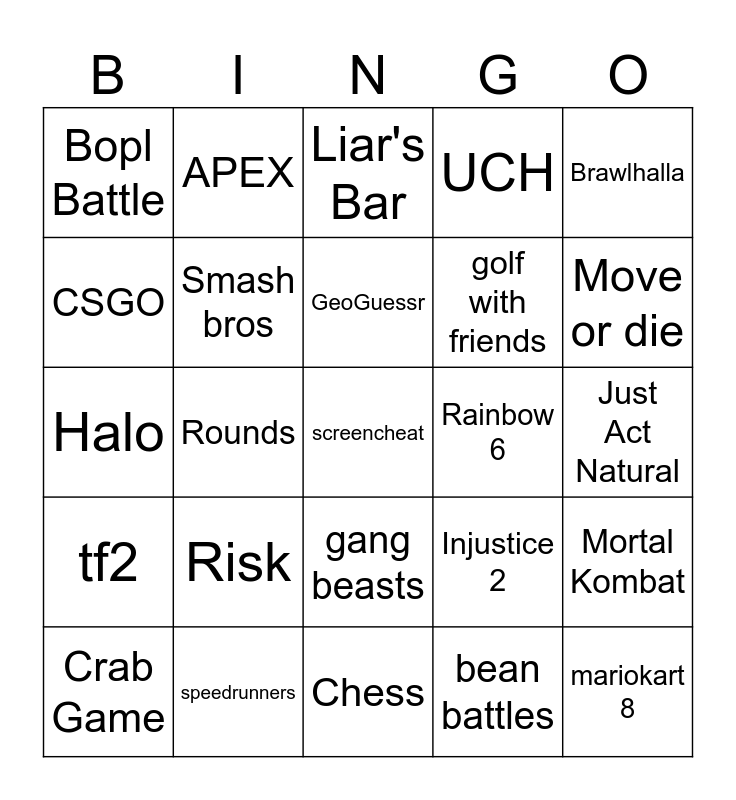 This bingo card has 25 words: Risk, Chess, GeoGuessr, Crab Game, Brawlhalla, Bopl Battle, CSGO, APEX, Rainbow 6, gang beasts, golf with friends, Halo, Injustice 2, Mortal Kombat, Smash bros, mariokart 8, Just Act Natural, Liar's Bar, Move or die, Rounds, screencheat, speedrunners, tf2, UCH and bean battles.