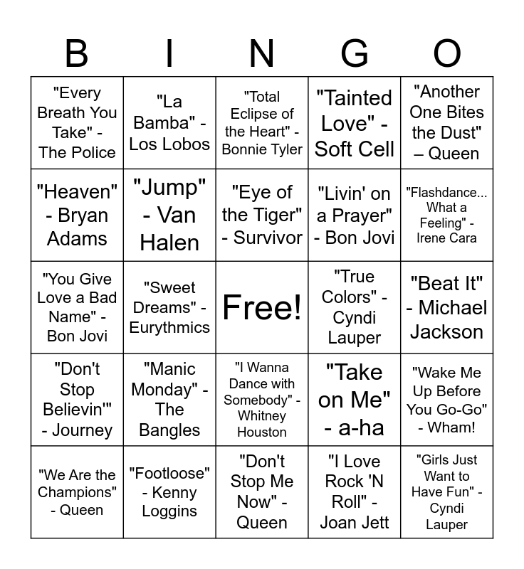 This bingo card has a free space and 25 words: "Manic Monday" - The Bangles, "Don't Stop Me Now" - Queen, "Eye of the Tiger" - Survivor, "We Are the Champions" - Queen, "Another One Bites the Dust" – Queen, "Every Breath You Take" - The Police, "Heaven" - Bryan Adams, "La Bamba" - Los Lobos, "True Colors" - Cyndi Lauper, "I Wanna Dance with Somebody" - Whitney Houston, "Livin' on a Prayer" - Bon Jovi, "You Give Love a Bad Name" - Bon Jovi, "Take on Me" - a-ha, "Wake Me Up Before You Go-Go" - Wham!, "Jump" - Van Halen, "Billie Jean" - Michael Jackson, "Beat It" - Michael Jackson, "Total Eclipse of the Heart" - Bonnie Tyler, "Flashdance... What a Feeling" - Irene Cara, "Sweet Dreams" - Eurythmics, "Girls Just Want to Have Fun" - Cyndi Lauper, "Footloose" - Kenny Loggins, "Don't Stop Believin'" - Journey, "Tainted Love" - Soft Cell and "I Love Rock 'N Roll" - Joan Jett.