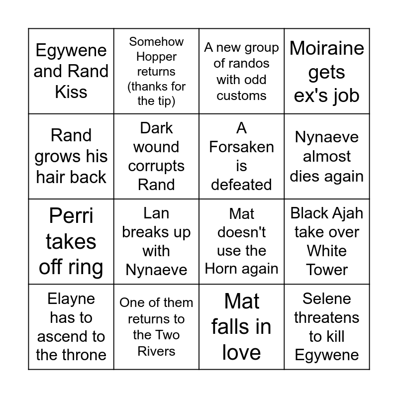This bingo card has 16 words: One of them returns to the Two Rivers, Black Ajah take over White Tower, A new group of randos with odd customs, Egywene and Rand Kiss, Perri takes off ring, Somehow Hopper returns (thanks for the tip), Mat doesn't use the Horn again, Mat falls in love, Rand grows his hair back, Dark wound corrupts Rand, Elayne has to ascend to the throne, Moiraine gets ex's job, Lan breaks up with Nynaeve, Nynaeve almost dies again, A Forsaken is defeated and Selene threatens to kill Egywene.