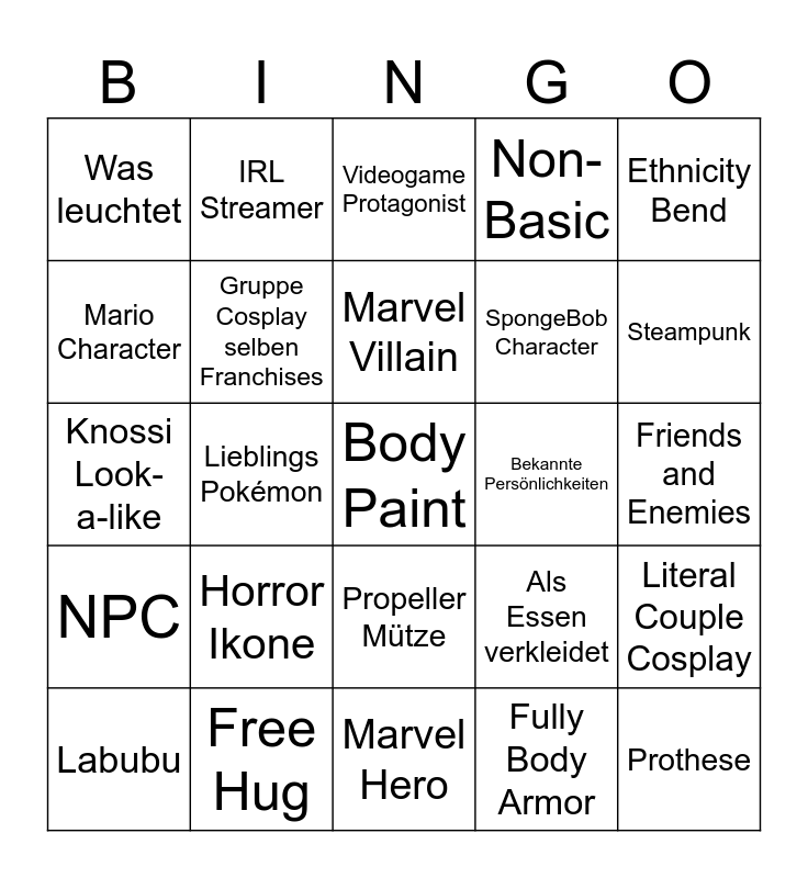 This bingo card has 25 words: Horror Ikone, Marvel Hero, Marvel Villain, Labubu, Ethnicity Bend, Was leuchtet, Mario Character, IRL Streamer, Bekannte Persönlichkeiten, Propeller Mütze, SpongeBob Character, Knossi Look-a-like, Als Essen verkleidet, Literal Couple Cosplay, Gruppe Cosplay selben Franchises, Prothese, Friends and Enemies, Videogame Protagonist, Steampunk, Lieblings Pokémon, Body Paint, Free Hug, NPC, Non-Basic and Fully Body Armor.