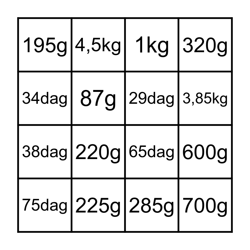 This bingo card has 16 words: 225g, 600g, 1kg, 195g, 38dag, 4,5kg, 65dag, 285g, 34dag, 87g, 75dag, 320g, 220g, 3,85kg, 29dag and 700g.