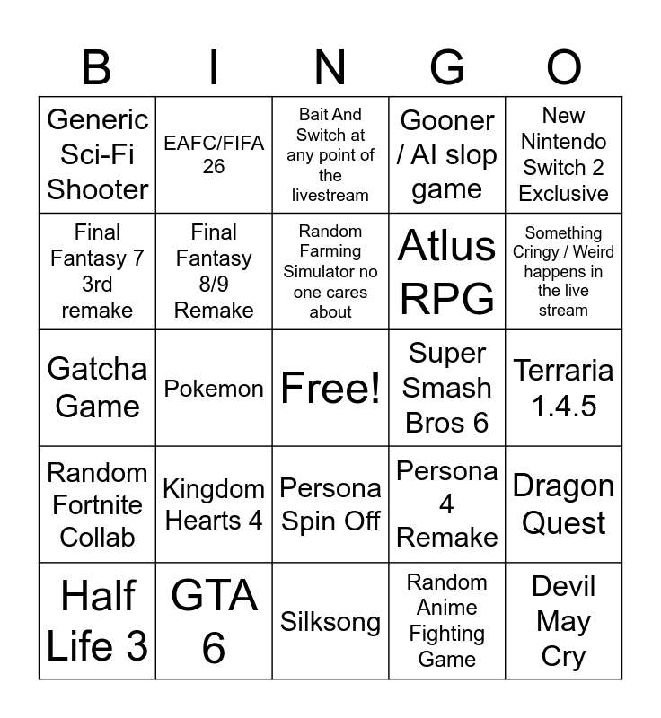 This bingo card has a free space and 24 words: Kingdom Hearts 4, GTA 6, Random Farming Simulator no one cares about, Half Life 3, New Nintendo Switch 2 Exclusive, Generic Sci-Fi Shooter, Final Fantasy 7 3rd remake, EAFC/FIFA 26, Super Smash Bros 6, Persona Spin Off, Atlus RPG, Gatcha Game, Persona 4 Remake, Dragon Quest, Final Fantasy 8/9 Remake, Random Anime Fighting Game, Terraria 1.4.5, Bait And Switch at any point of the livestream, Something Cringy / Weird happens in the live stream, Pokemon, Devil May Cry, Random Fortnite Collab, Gooner / AI slop game and Silksong.