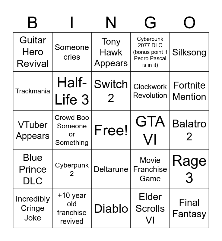 This bingo card has a free space and 24 words: Cyberpunk 2, +10 year old franchise revived, Switch 2, Incredibly Cringe Joke, Silksong, Guitar Hero Revival, Trackmania, Someone cries, GTA VI, Deltarune, Clockwork Revolution, VTuber Appears, Movie Franchise Game, Rage 3, Half-Life 3, Elder Scrolls VI, Balatro 2, Tony Hawk Appears, Fortnite Mention, Crowd Boo Someone or Something, Final Fantasy, Blue Prince DLC, Cyberpunk 2077 DLC (bonus point if Pedro Pascal is in it) and Diablo.