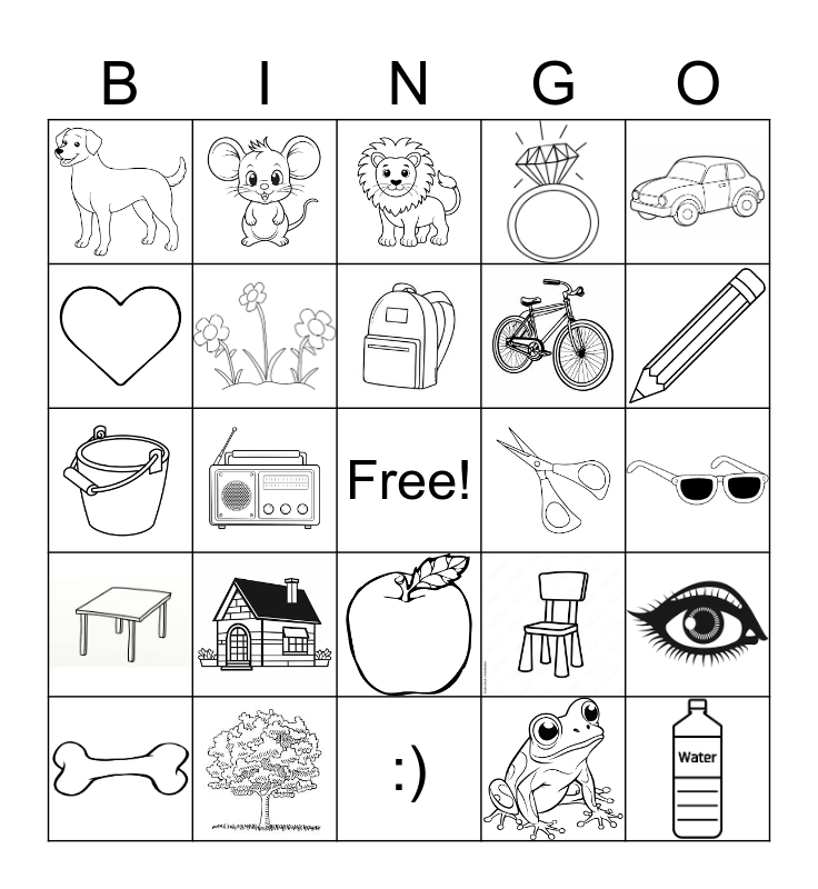 This bingo card has 23 images, a free space and 1 words: :).