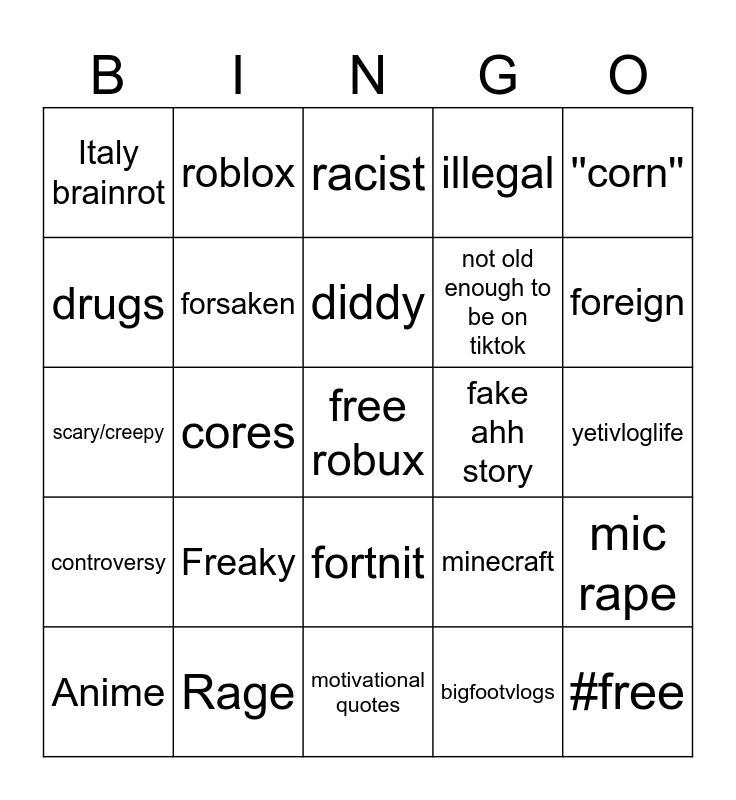 This bingo card has a free space and 24 words: Freaky, Rage, diddy, Anime, ''corn'', Italy brainrot, drugs, roblox, fake ahh story, fortnit, not old enough to be on tiktok, scary/creepy, minecraft, mic rape, forsaken, bigfootvlogs, yetivloglife, racist, foreign, cores, #free, controversy, illegal and motivational quotes.