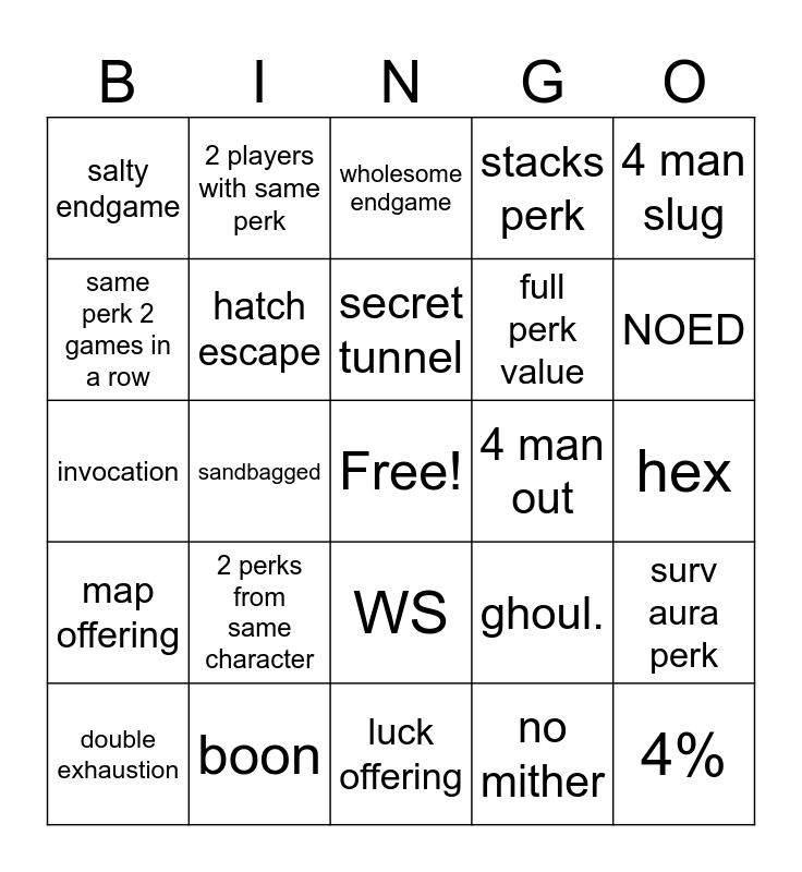 This bingo card has a free space and 24 words: 2 perks from same character, boon, secret tunnel, double exhaustion, 4 man slug, salty endgame, same perk 2 games in a row, 2 players with same perk, 4 man out, WS, full perk value, invocation, ghoul., surv aura perk, hatch escape, no mither, hex, wholesome endgame, NOED, sandbagged, 4%, map offering, stacks perk and luck offering.