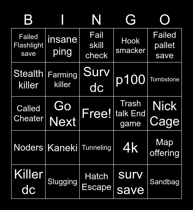This bingo card has a free space and 24 words: Kaneki, Slugging, Surv dc, Killer dc, Failed pallet save, Failed Flashlight save, Stealth killer, insane ping, Trash talk End game, Tunneling, p100, Called Cheater, 4k, Map offering, Farming killer, surv save, Nick Cage, Fail skill check, Tombstone, Go Next, Sandbag, Noders, Hook smacker and Hatch Escape.