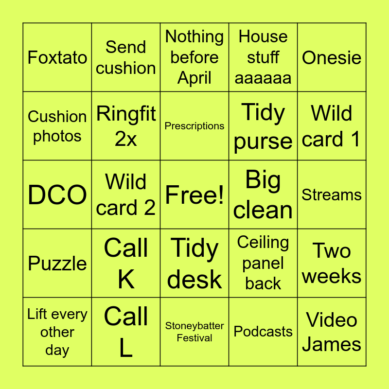 This bingo card has a free space and 24 words: Call K, Call L, Prescriptions, Lift every other day, Onesie, Foxtato, Cushion photos, Send cushion, Big clean, Tidy desk, Tidy purse, DCO, Ceiling panel back, Two weeks, Ringfit 2x, Podcasts, Streams, Nothing before April, Wild card 1, Wild card 2, Video James, Puzzle, House stuff aaaaaa and Stoneybatter Festival.