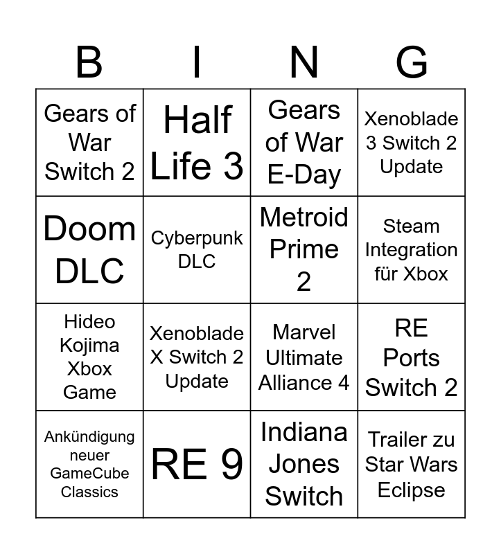 This bingo card has 16 words: RE 9, RE Ports Switch 2, Gears of War E-Day, Gears of War Switch 2, Hideo Kojima Xbox Game, Half Life 3, Marvel Ultimate Alliance 4, Indiana Jones Switch, Doom DLC, Cyberpunk DLC, Ankündigung neuer GameCube Classics, Xenoblade 3 Switch 2 Update, Xenoblade X Switch 2 Update, Steam Integration für Xbox, Metroid Prime 2 and Trailer zu Star Wars Eclipse.