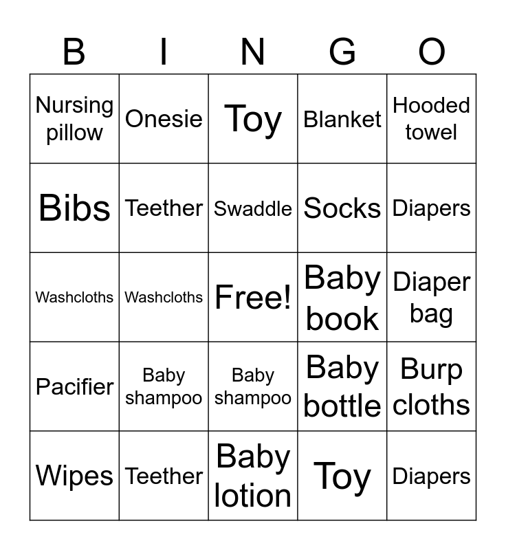 This bingo card has a free space and 49 words: FREE, Diapers, Wipes, Baby lotion, Baby shampoo, Pacifier, Onesie, Booties, Bibs, Rattle, Teether, Blanket, Burp cloths, Baby bottle, Diaper bag, Changing pad, Swaddle, Baby book, Mittens, Hooded towel, Washcloths, Toy, Nursing pillow, Socks, Gift card, Diapers, Wipes, Baby lotion, Baby shampoo, Pacifier, Onesie, Booties, Bibs, Rattle, Teether, Blanket, Burp cloths, Baby bottle, Diaper bag, Changing pad, Swaddle, Baby book, Mittens, Hooded towel, Washcloths, Toy, Nursing pillow, Socks and Gift card.
